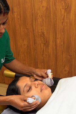 - diariamente 2 tratamientos ayurvédicos (aprox. 1,5 h) según el enfoque y prescripción del médico ayurvédico p. ej. masaje con polvo Udvartana, masaje con bolsas de hierbas Pinda Sveda, masaje con aceite Abhyanga, aplicación de aceite medicinal en la frente Shirodhara, cuidado facial Mukhalepam, masaje con bolsas de arroz Njavarakizhi, tratamiento de pies y ojos Netra Raksha.